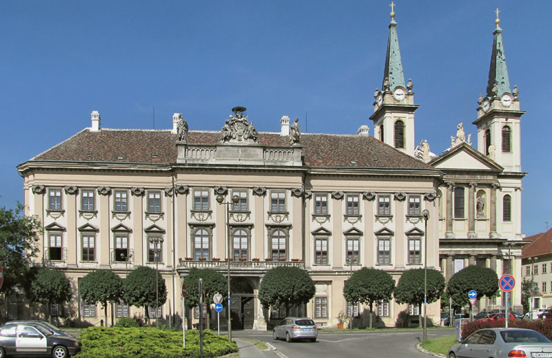 A szomszédos Püspöki Palota épületét ugyancsak Hefele Menyhért tervezte késő barokk stílusban. A földszinti boltozott kocsibejáróból díszes lépcső vezet a palota legpompásabb termébe, melynek belső terét Anton Maulbertsch freskói díszítik. Földszintjén látogatható a Sala Terrena - az ország első olyan múzeuma, ahol a római korból fennmaradt feliratos kövek kiállítása látható. Ennek falfestményeit Dorffmeister István festette, melyek az ő korában ismert antik római világot mutatják be.